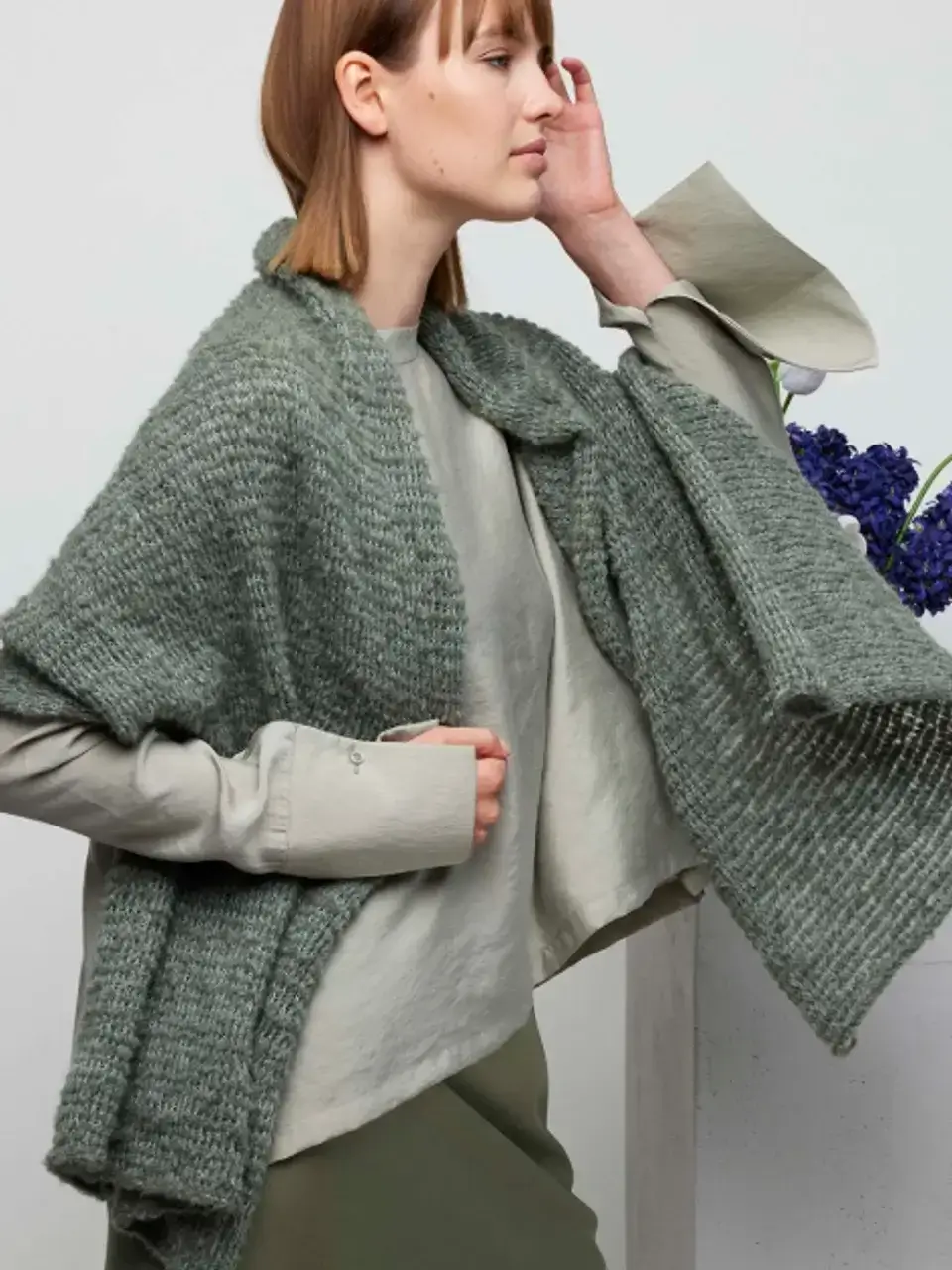 Пряжа создаёт уникальную текстуру с эффектом плюшевого полотна. При этом изнаночная сторона напоминает букле. Это позволяет создавать красивые текстурные узоры без особых усилий. Изделия получаются с выразительной и живой пластикой.